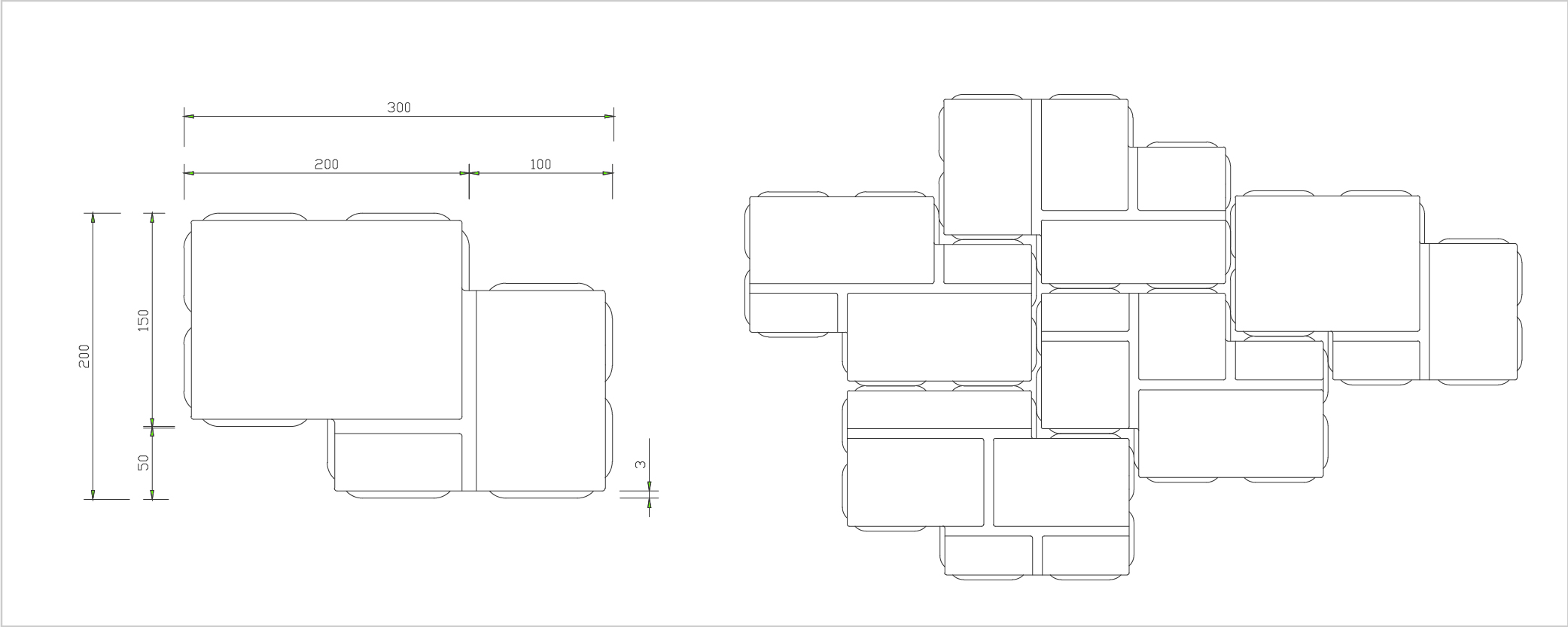 • 소형석재포장을 보도블록 형식으로 재해석한 제품으로 한 개의 블록 표면에 다양한 규격의 사각블록들을 표현하여